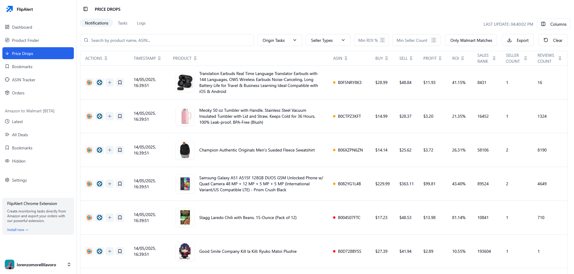 Enter specific ASINs to monitor, define a target price, and receive a notification once it is reached.
